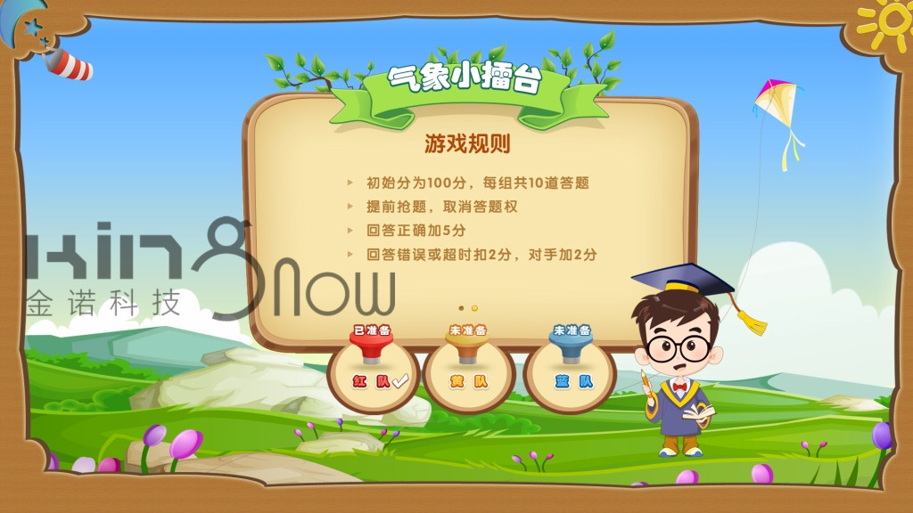 1、設(shè)計氣象小博士的卡通形象作為裁判,引導(dǎo)觀眾體驗整個游戲;