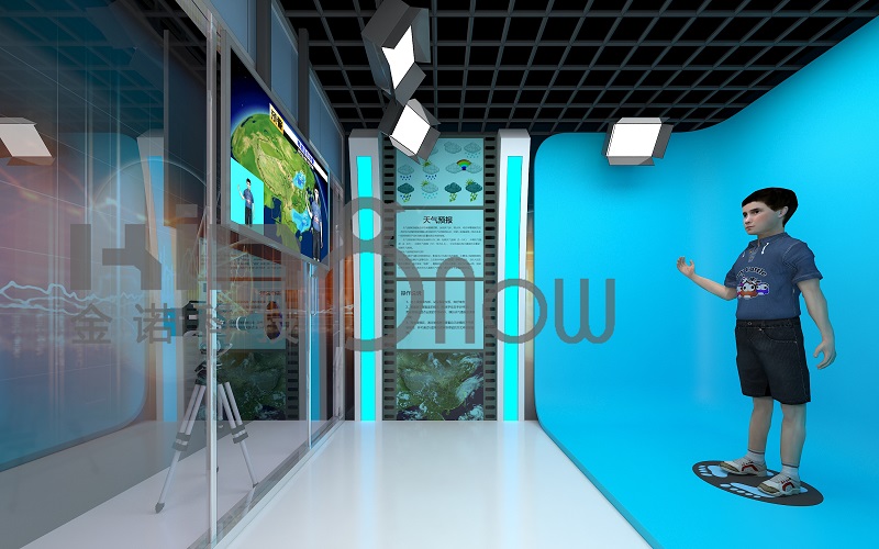 觀眾進(jìn)入空間內(nèi)部,攝像頭將觀眾的影像摳下并采集到顯示屏的場(chǎng)景中,觀眾會(huì)感覺(jué)到自己置身于真實(shí)的天氣預(yù)報(bào)演播室一般。