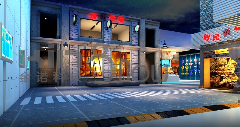 展項(xiàng)設(shè)計(jì)獨(dú)立的體驗(yàn)空間,借助造景環(huán)境、煙霧機(jī)、暖風(fēng)扇、火焰燈、顯示屏等設(shè)施,模擬一個(gè)已經(jīng)發(fā)生火災(zāi)的高層住宅現(xiàn)場(chǎng),參與者在昏暗的并伴有煙霧的場(chǎng)景中進(jìn)行逃生模擬,只有采取正確的逃生措施才不會(huì)觸發(fā)錯(cuò)誤提示,否則會(huì)觸發(fā)錯(cuò)誤提示。