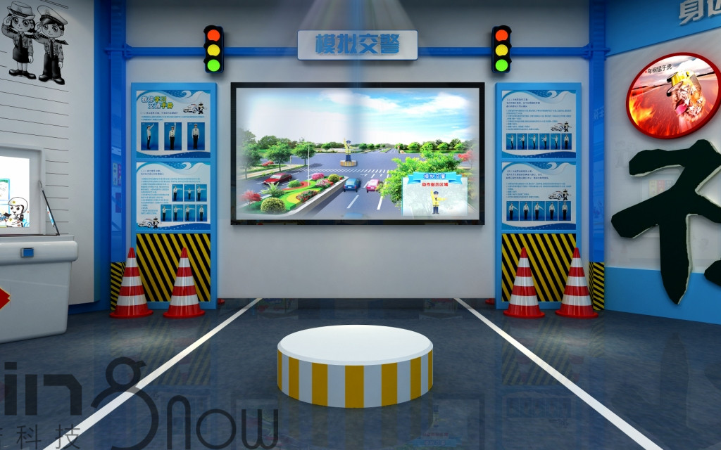 該產(chǎn)品使參與者體驗(yàn)交警角色,根據(jù)不同交通狀態(tài)進(jìn)行道路疏導(dǎo)。展項(xiàng)在墻面上設(shè)置投影幕,投影幕頂端安裝攝像頭,前方營(yíng)造交通十字口的交通指揮臺(tái),頂部設(shè)置投影機(jī)正對(duì)投影幕投影,營(yíng)造交通路口的場(chǎng)景;觀眾站在交通指揮臺(tái)上參與展項(xiàng)互動(dòng),根據(jù)投影畫面中出現(xiàn)的各個(gè)交通擁擠情況。同時(shí)投影畫面的右下端有虛擬的卡通交警指導(dǎo)正確交警手勢(shì),觀眾比擬手勢(shì)疏導(dǎo)交通,攝像頭識(shí)別觀眾指揮的動(dòng)作,并判斷正確如否,若指揮正確,則投影畫面中的交通成功疏散,若錯(cuò)誤則出現(xiàn)交通癱瘓的畫面;共設(shè)置八套交通指示動(dòng)作,指示動(dòng)作與交通手勢(shì)一致。