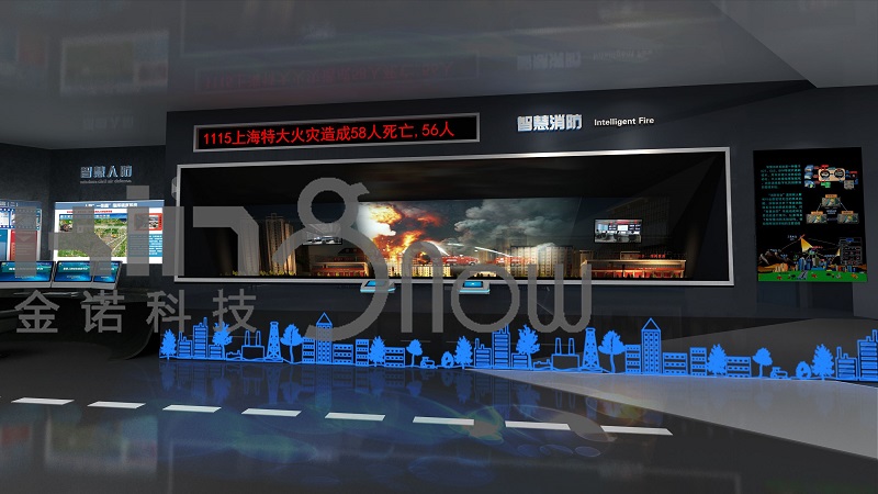 當(dāng)參觀者觸摸感應(yīng)按鈕時,立體建筑剖面模型中的煙霧發(fā)生器和報警器啟動,建筑模型中的真實消防系統(tǒng)啟動,與液晶顯示屏、幻影成像畫面聯(lián)動,綜合介紹智慧消防系統(tǒng)的系統(tǒng)組成和主要功能。