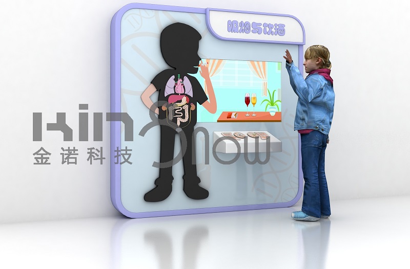 觀眾按下任意按鈕,人物呈現(xiàn)對(duì)應(yīng)動(dòng)作,冷光膜燈光演示香煙/酒精進(jìn)入人體內(nèi)的過(guò)程,同時(shí),液晶電視分屏播放危害健康的科普動(dòng)畫(huà)。