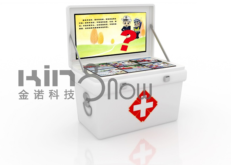 設(shè)置一臺液晶顯示屏,觀眾拍下臺面上任意圖案按鈕,顯示屏中將會播放對應(yīng)的遇險自救視頻,讓觀眾了解遇到突發(fā)情況的遇險自救知識。