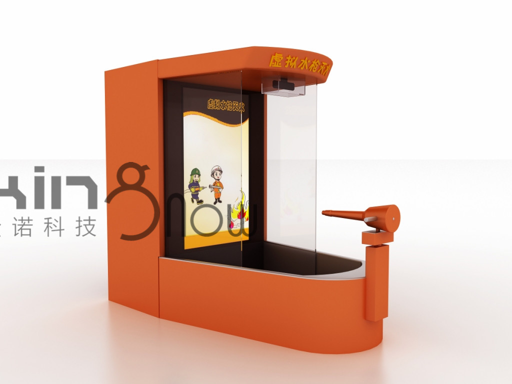 通過多媒體場(chǎng)景模擬火災(zāi),參與者操作水槍進(jìn)行滅火演習(xí)。該展項(xiàng)直接將消防水槍改制為展品所用,噴水嘴可隱蔽調(diào)節(jié);顯示屏幕用鋼化玻璃封閉,在游戲過程中,當(dāng)水槍朝屏幕噴出水時(shí),運(yùn)用電容觸摸屏技術(shù),做到精確的檢測(cè)指向,介紹相關(guān)的消防知識(shí)。水流流向玻璃下方的水槽中,水槽的水面上覆蓋不銹鋼網(wǎng)罩,具備可以排盡積水排水口,保證了換水的方便。