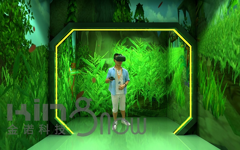 觀眾佩戴VR頭盔,通過VR手柄參與游戲互動(dòng),選擇不同的農(nóng)作物角色進(jìn)入游戲,通過手柄發(fā)射各種“種子武器”,消滅隱藏在田間的有害植物。
