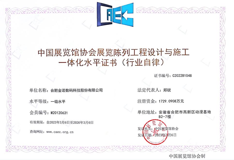 中國展覽館協(xié)會展覽陳列工程設(shè)計與施工一體化水平證書